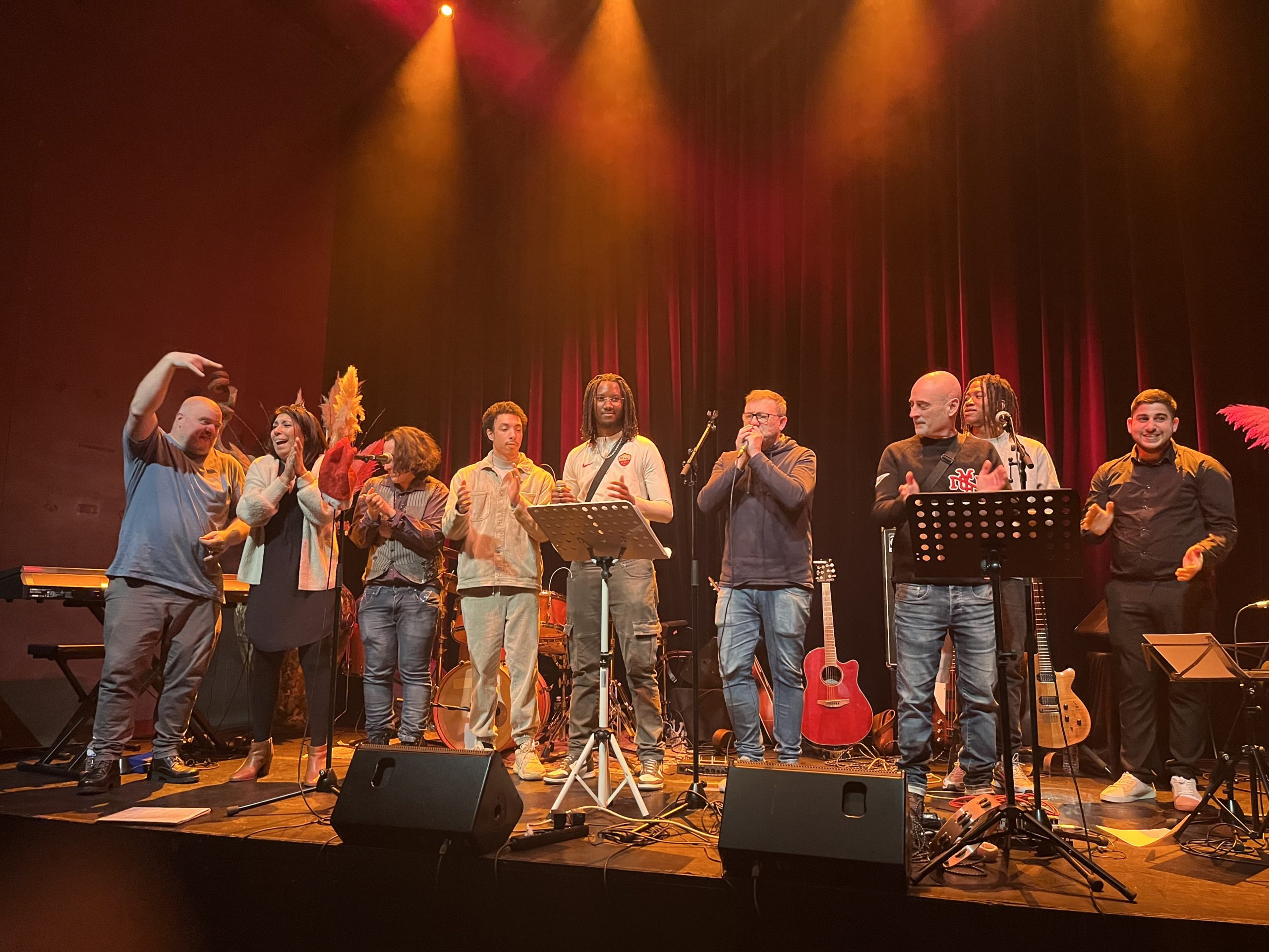 Un moment convivial et festif dans une trĂšs belle salle de concert louĂ©e pour l’occasion afin que nos formateurs (dont M. ClĂ©ment, M. Doucet, M. Cauchet Moscone et Mme M’Kasri… et le groupe de rock français Frent dont fait partie M. ClĂ©ment) ainsi que nos apprentis, puissent monter sur scĂšne et montrer leur talent !